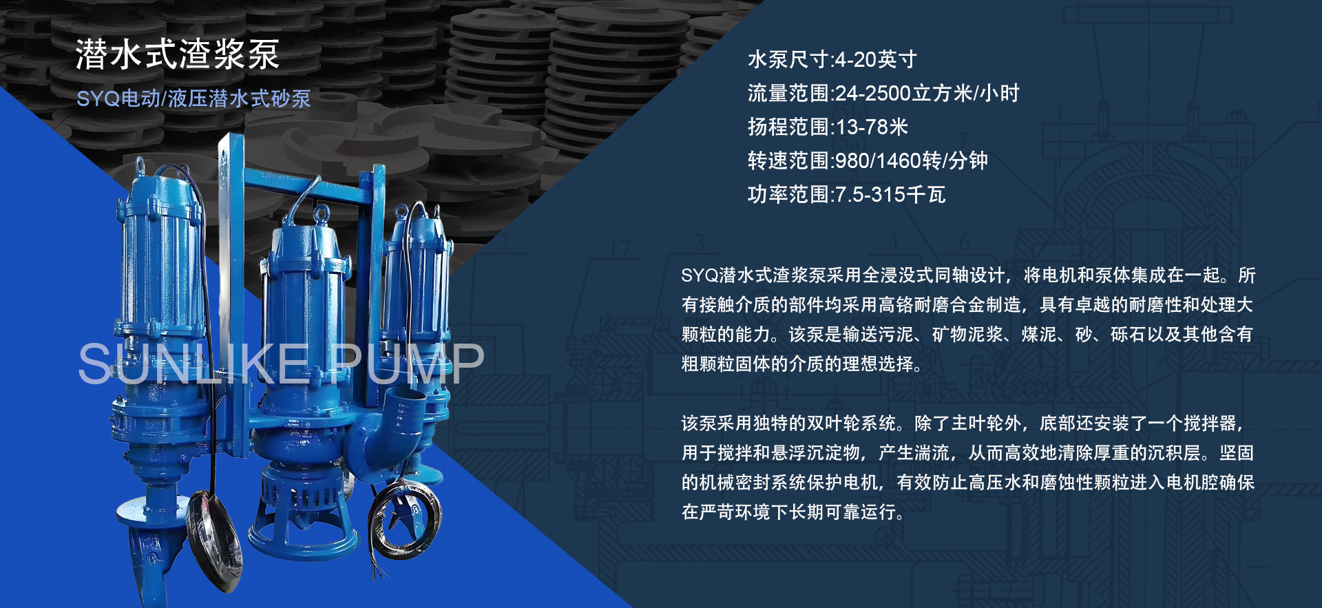 SYQ系列——带搅拌器的电动或液压潜水式渣浆泵。SYQ潜水式泥浆泵专为严苛的疏浚和采矿作业而设计,适用于输送污泥、矿浆、煤浆、砂砾等含有大颗粒固体的重质介质。每台泵底部均配备集成式搅拌器,以提高悬浮效率并最 大限度地提高输出能力。此外,还可选配侧切刀、底切刀或高压冲洗系统,以进一步提高固体浓度并增强疏浚性能。SYQ系列提供电动和液压两种驱动方式,以满足不同的作业需求。